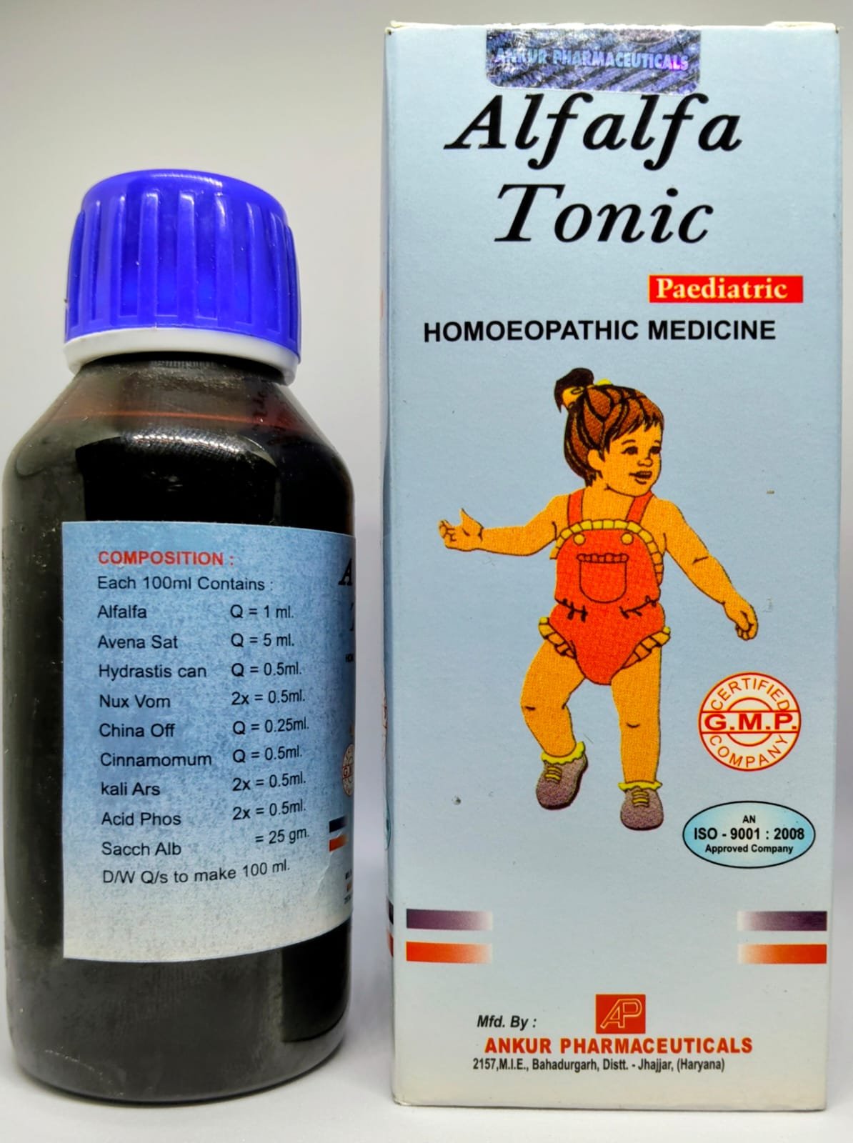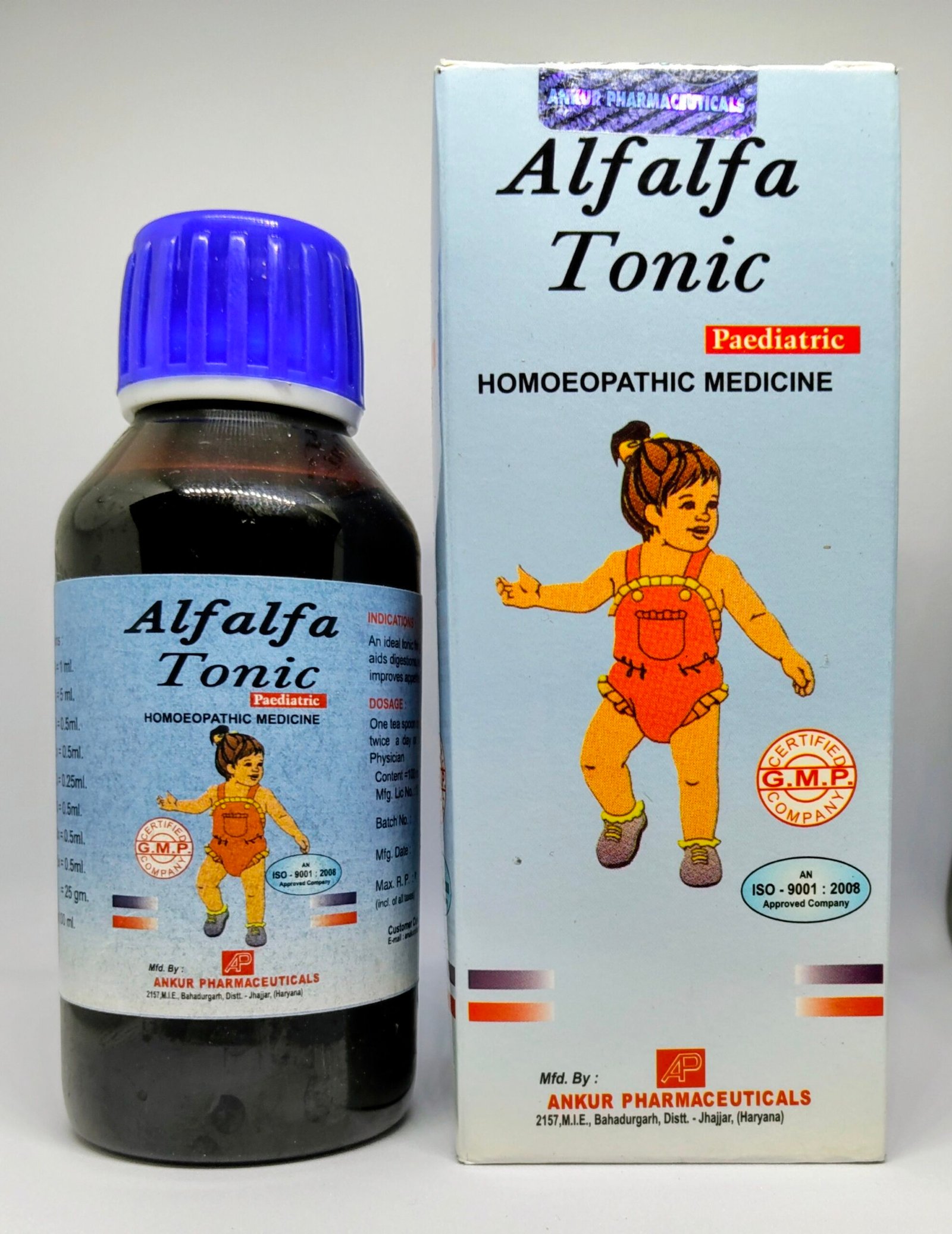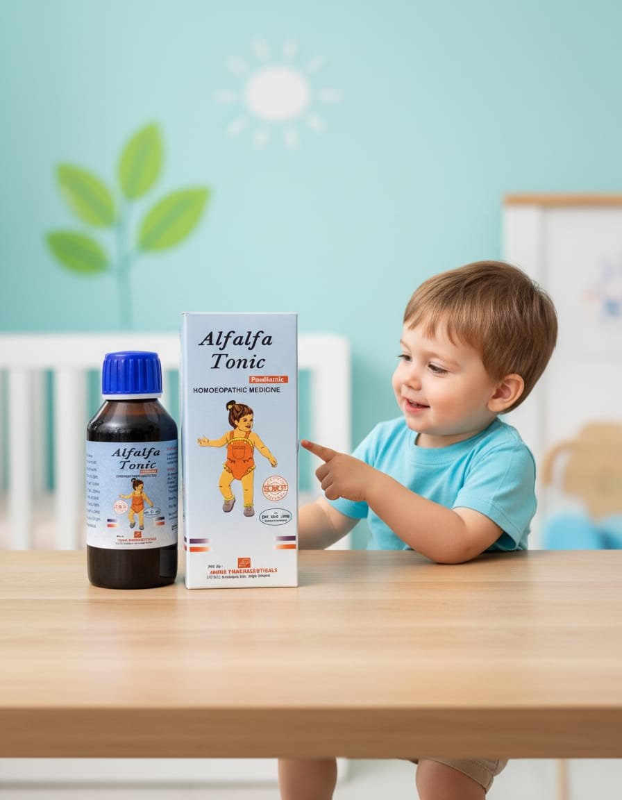 ALFALFA TONIC PEDIATRIC, a homoeopathic tonic specially formulated for children. This tonic is designed to improve appetite, promote weight gain, and reduce digestive disorders in children.