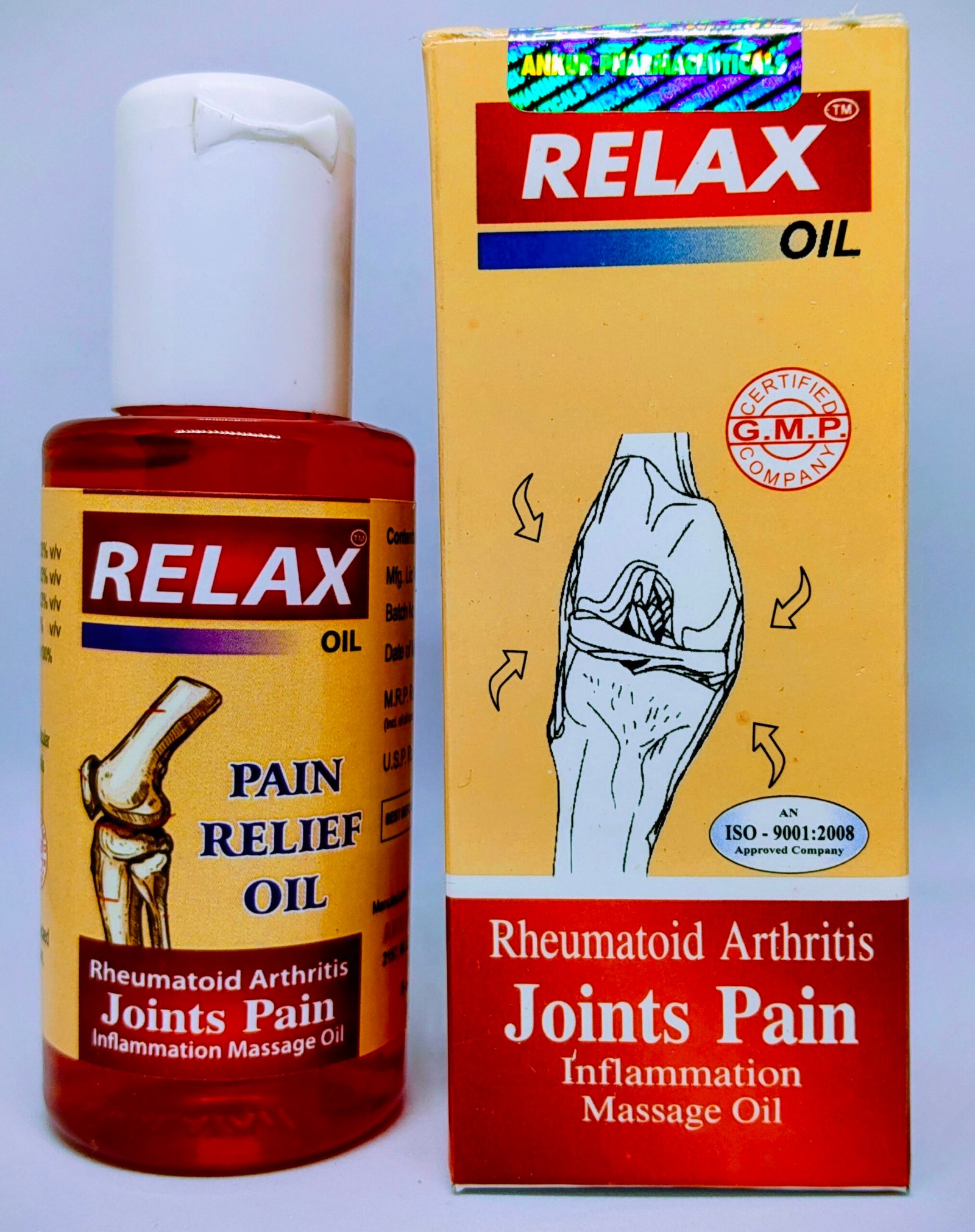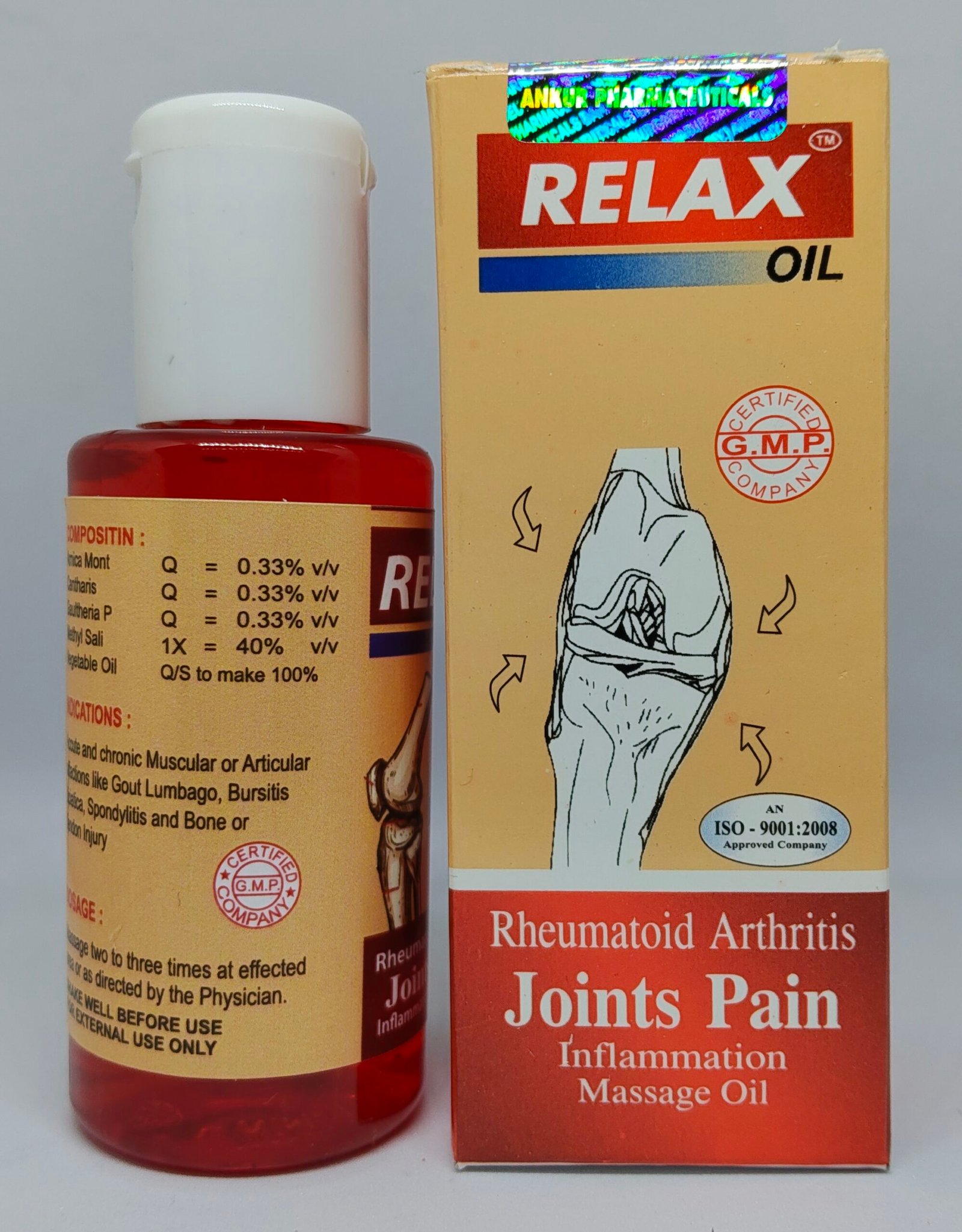 Indication: RELAX OIL is very effective in acute and chronic muscular or articular affections like gout lumbago, Arthritis, Rheumatic Pain, Blersities, Sciatica, Spondylitis, and bone tendon injury.